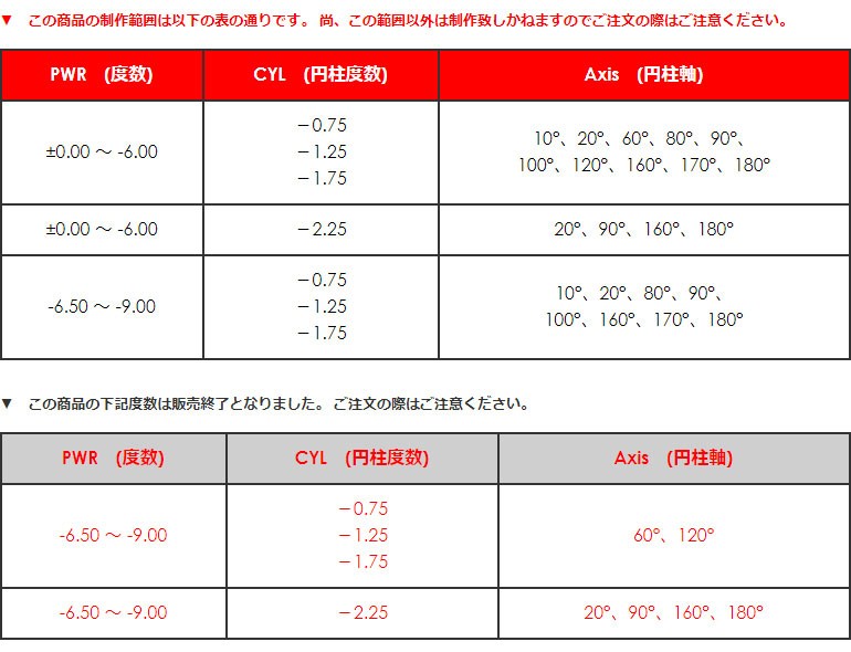 PWR(パワー):±0.00?-6.00(0.25step)・-6.50?9.00(0.50step)