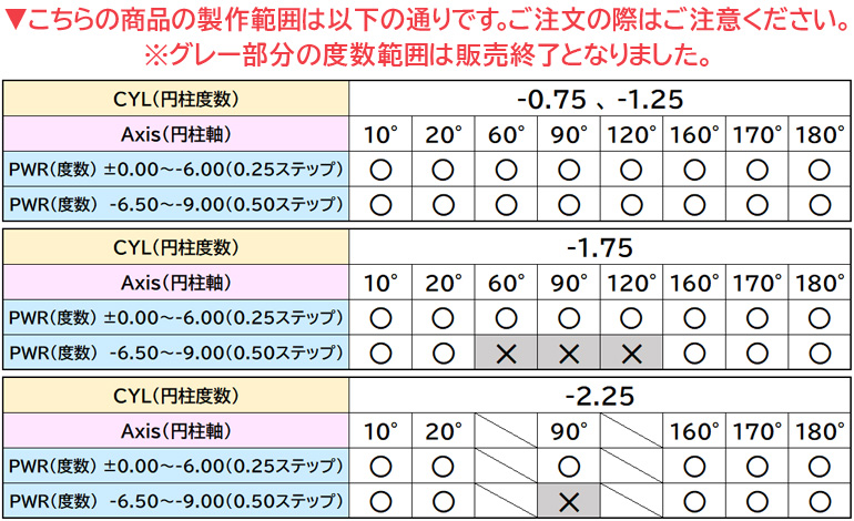CYL(円柱度数):-0.75、-1.25、-1.75、-2.25