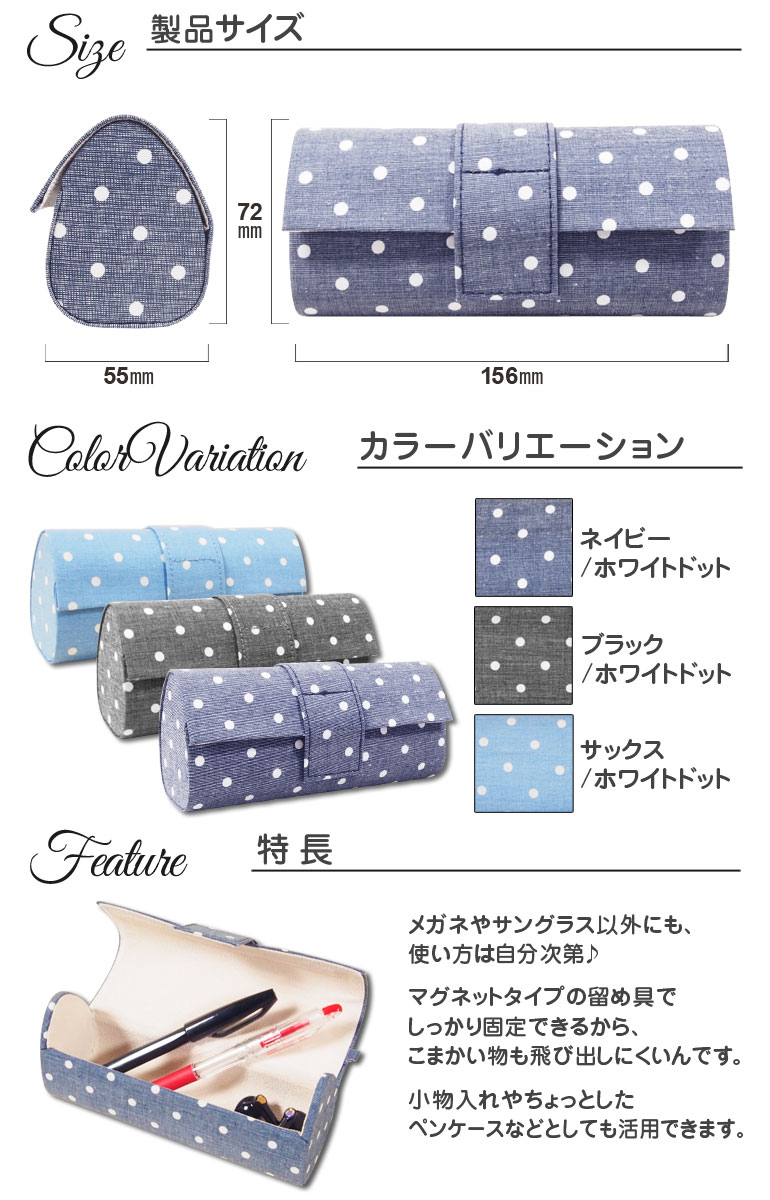 メガネケース ドット柄 全3カラー / 70c113 青山眼鏡 眼鏡 小物入れ ポーチ サングラスケース マグネットボタン 水玉模様 ネイビー ブラック サックス