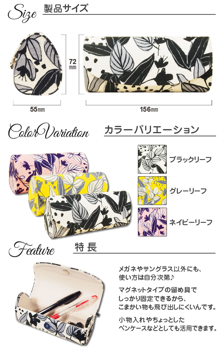 メガネケース リーフ柄 全3カラー / 70c121 青山眼鏡 眼鏡 小物入れ ポーチ サングラスケース マグネットボタン ボタニカル柄 ブラックリーフ グレーリーフ ネイビーリーフ