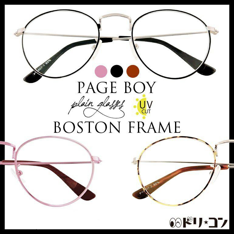 伊達メガネ UVカット付き 全3種 ボストンフレーム メタルフレーム アイウェア ブラック ブラウン ピンク※伊達メガネの為、各種調整及び度付レンズへの加工不可【ドリームコンタクト】