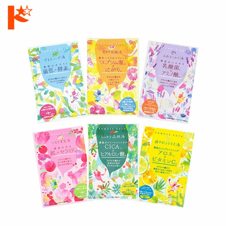 種類:さらりハーブ湯、つるり果実湯、ふわりミルク湯、きりり柑橘湯、しっとり森林湯、爽やかシトラス湯