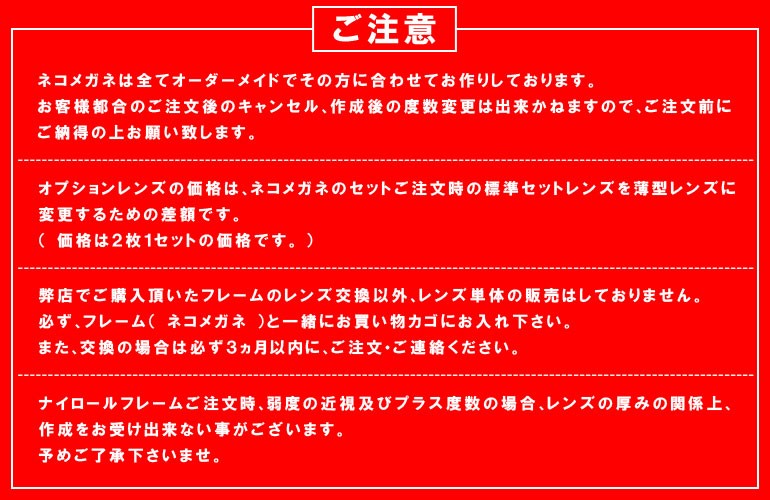 それでもお届けしましたネコメガネが下を向くたびにズレてしまうような場合等は、お手数でもお近くの眼鏡店で再フィッティングの調整を受けて頂きますよう、お願いします。