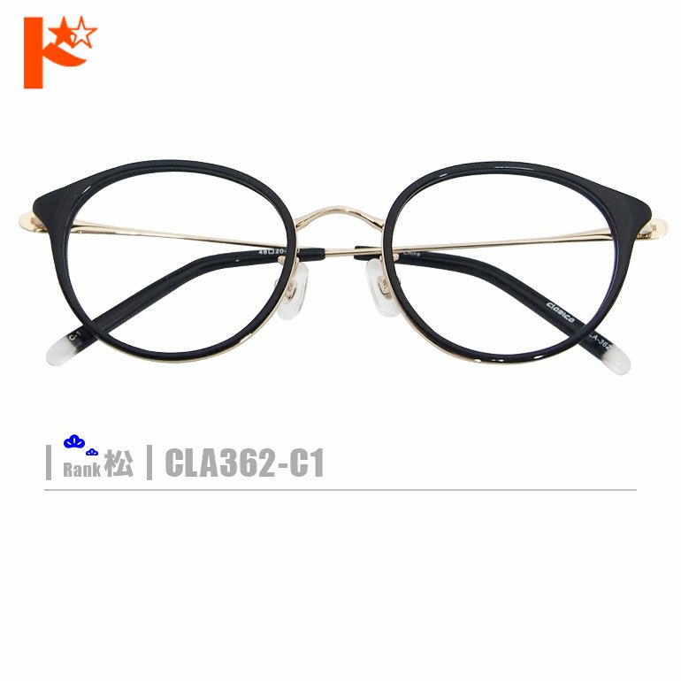 松ネコメガネ【CLA362-C1】(鼻パッド付コンビフレーム+薄型レンズ+メガネ拭き+ケース付き)黒系金系