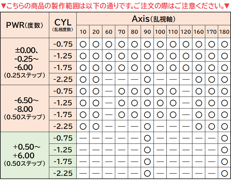CYL(乱視度数):-0.75、-1.25、-1.75、-2.25
